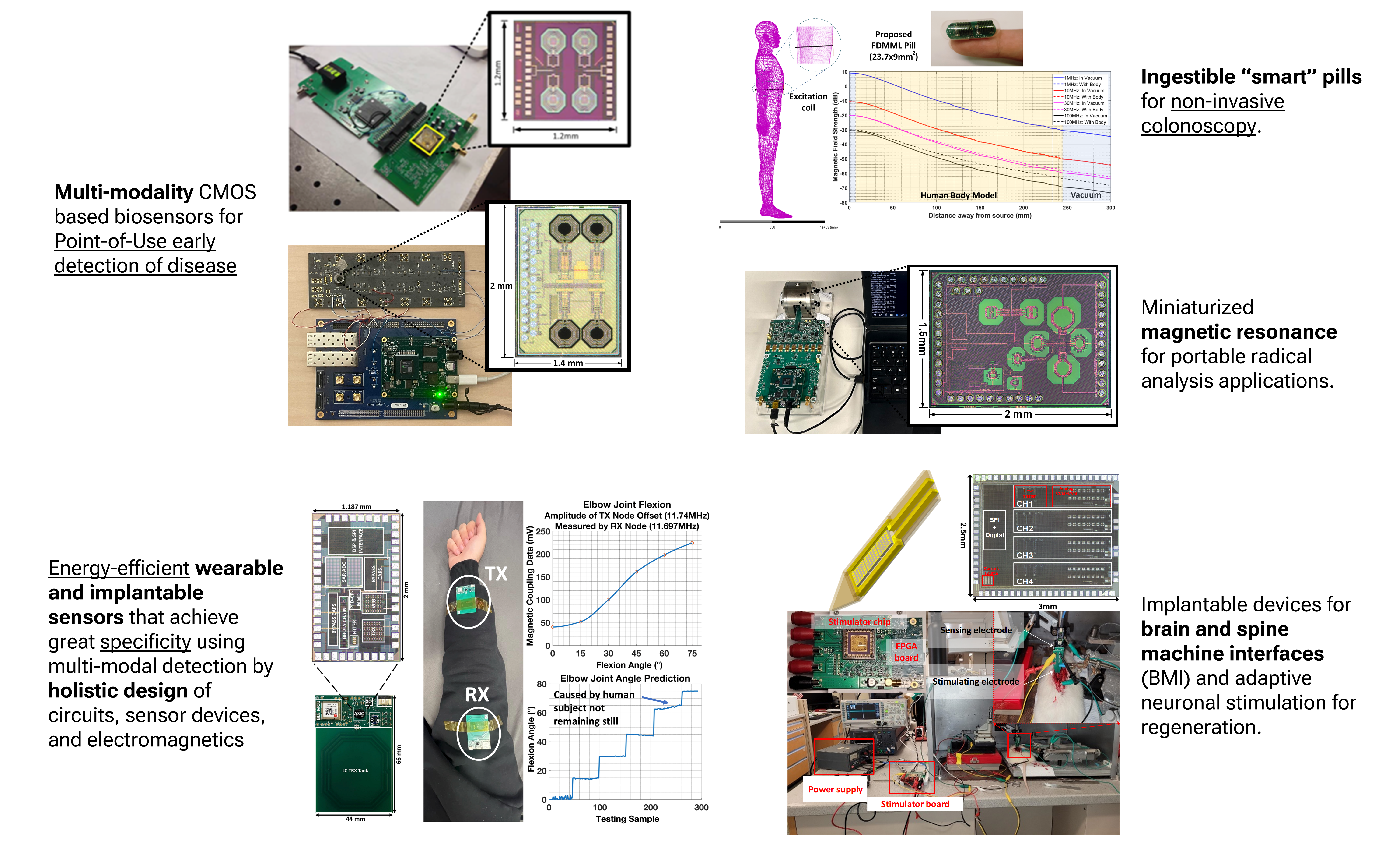 We are interested in a broad range of biomedical applications, including in-vitro sensors for Point-of-Use applications, wearable and implantable devices for sensing and actuation, and imaging and modeling techniques for targeted therapeutics.